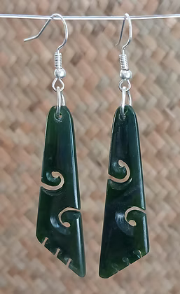 Crafted from authentic NZ greenstone, these Angled Earrings feature two elegant koru designs measuring 55mm each. Their unique shape symbolizes growth and new beginnings, making them a meaningful gift. Presented in a tasteful gift box, they are ready to impress for special occasions, blending cultural significance with refined style.